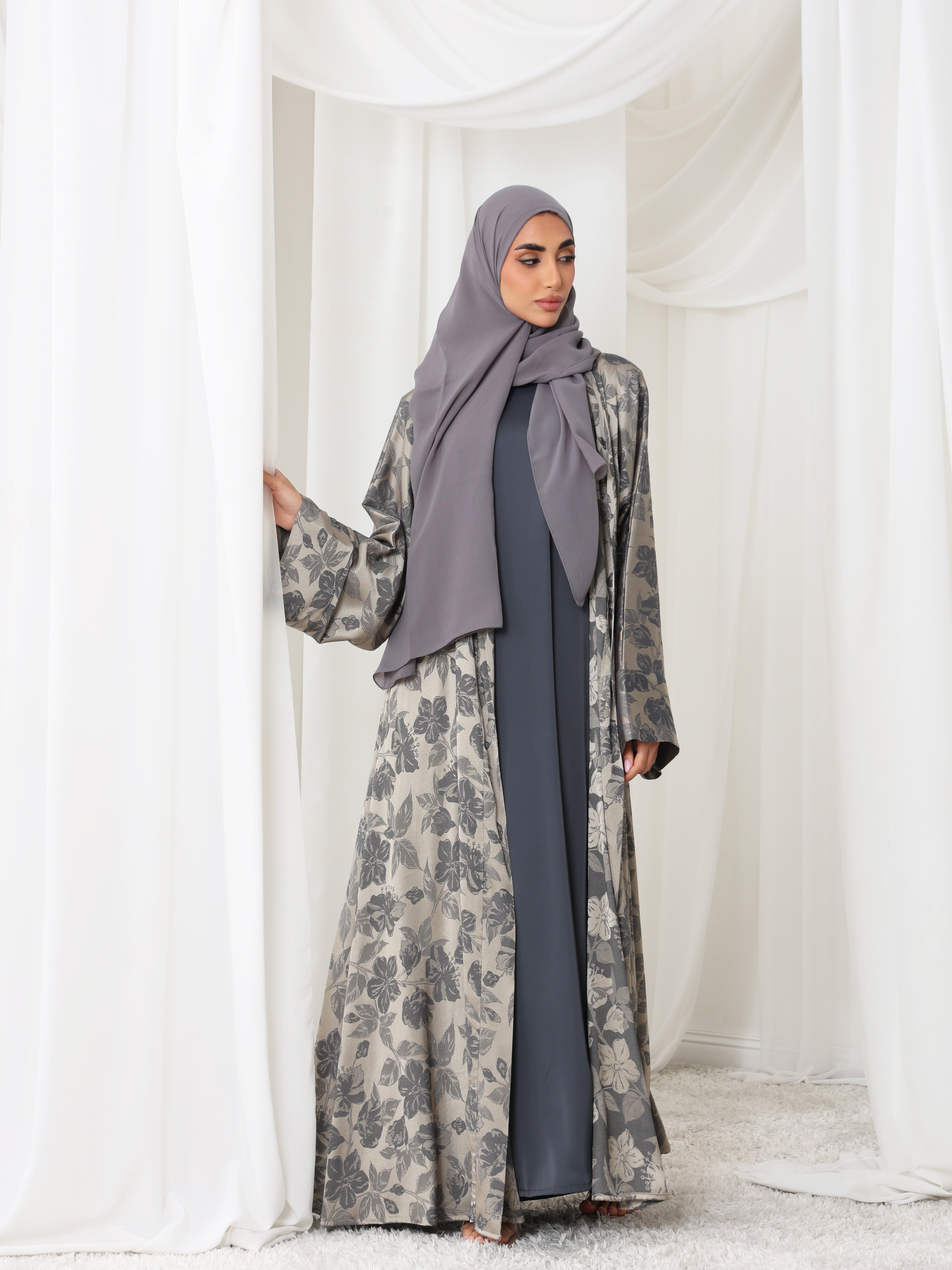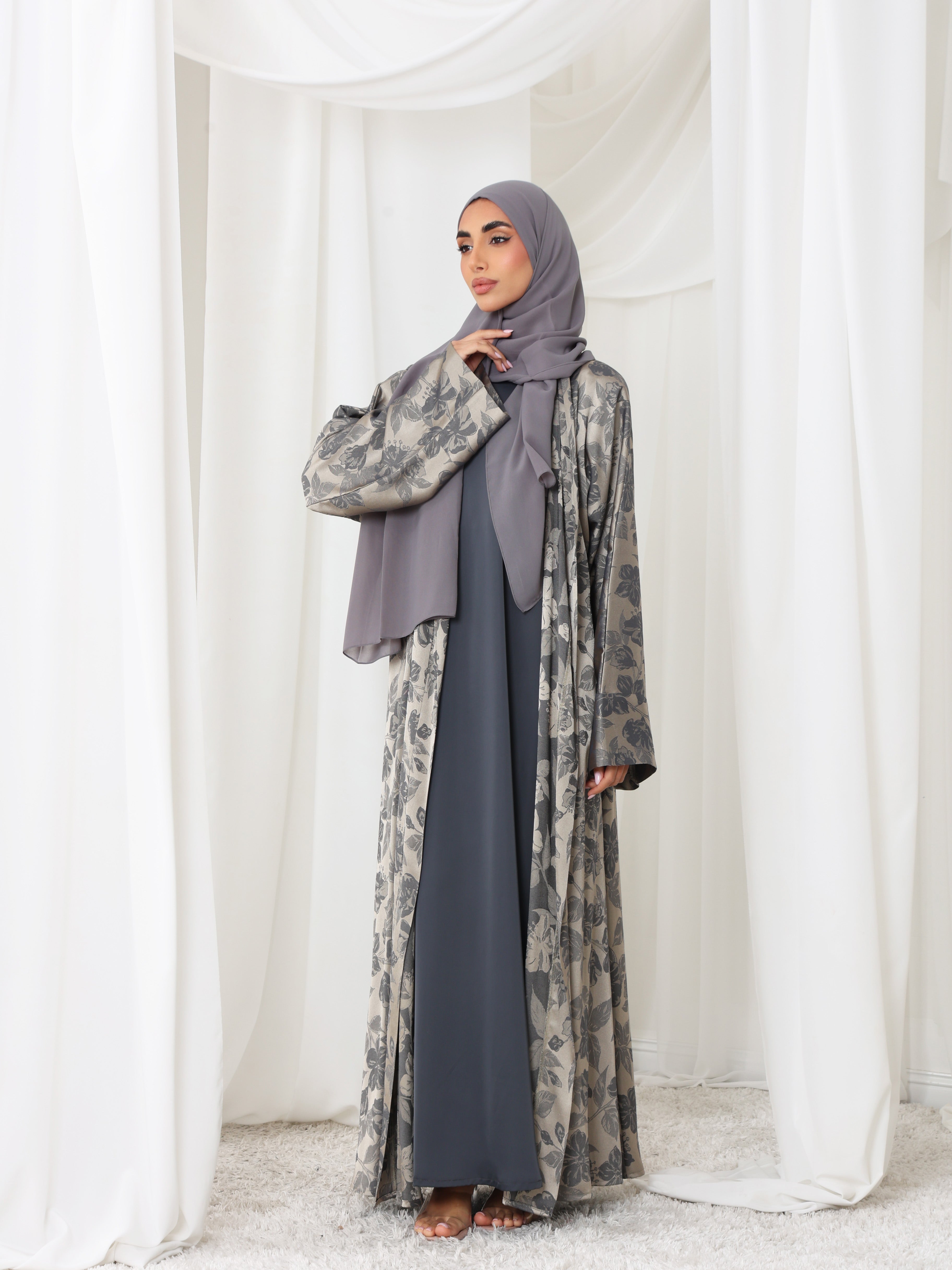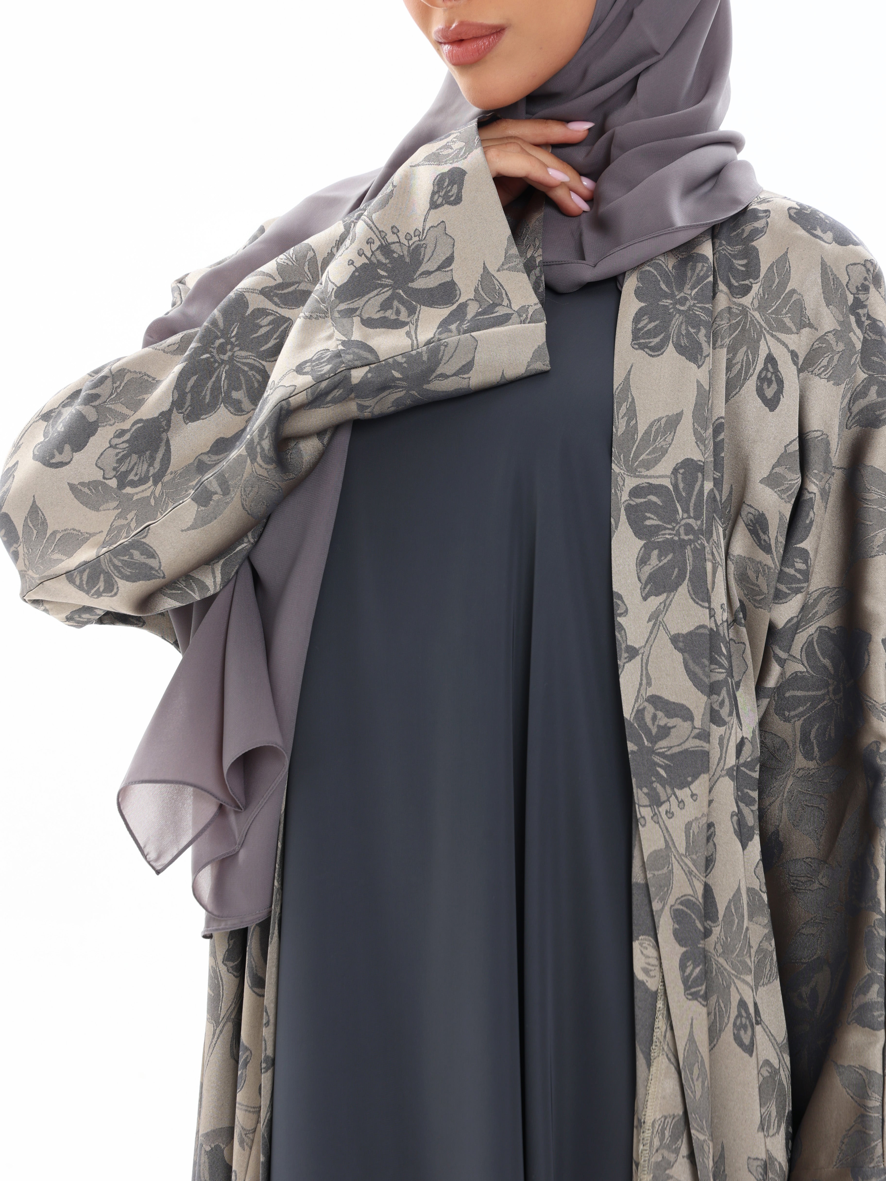 Muted slate tones blend with soft floral texture for understated depth.