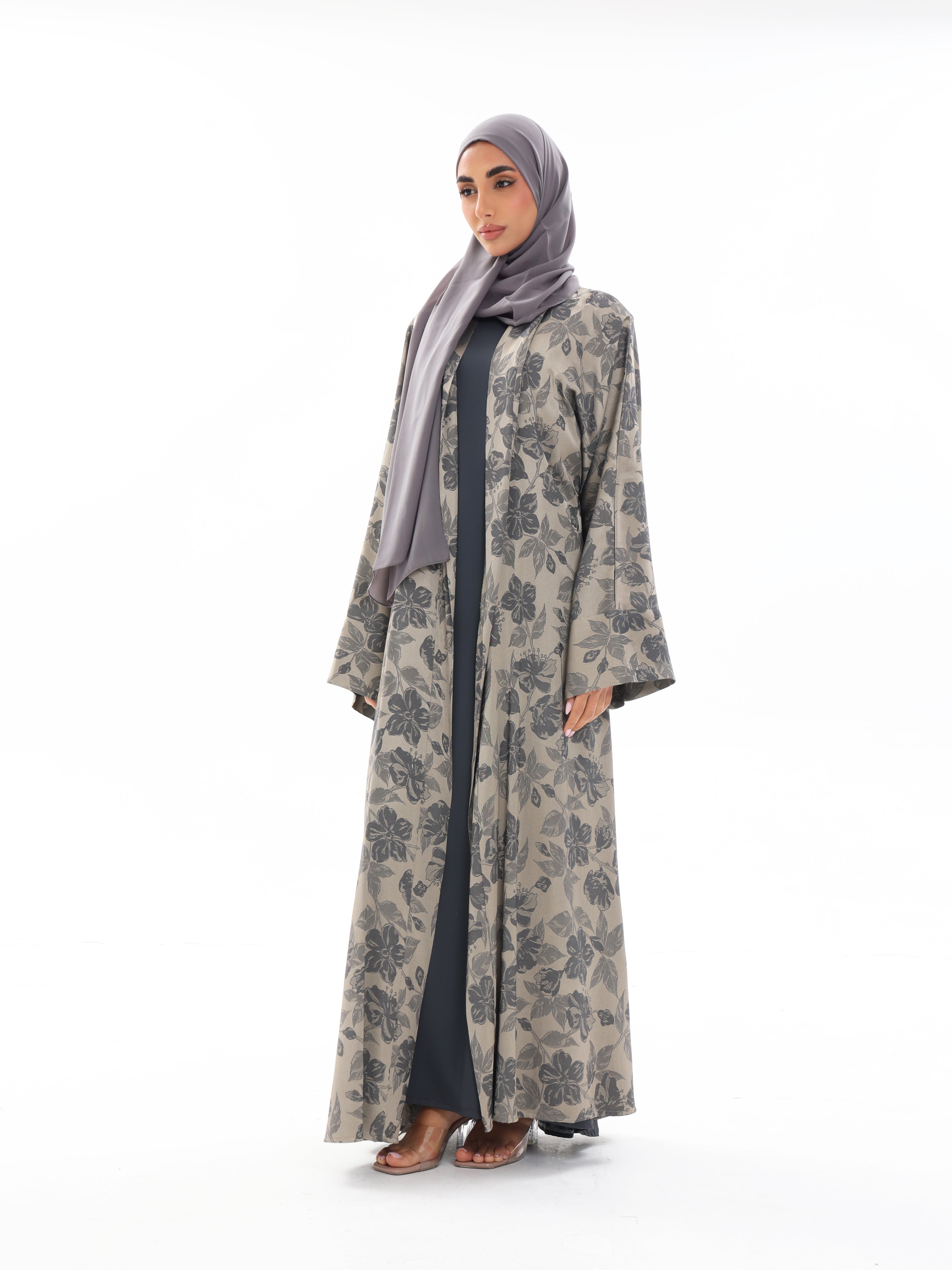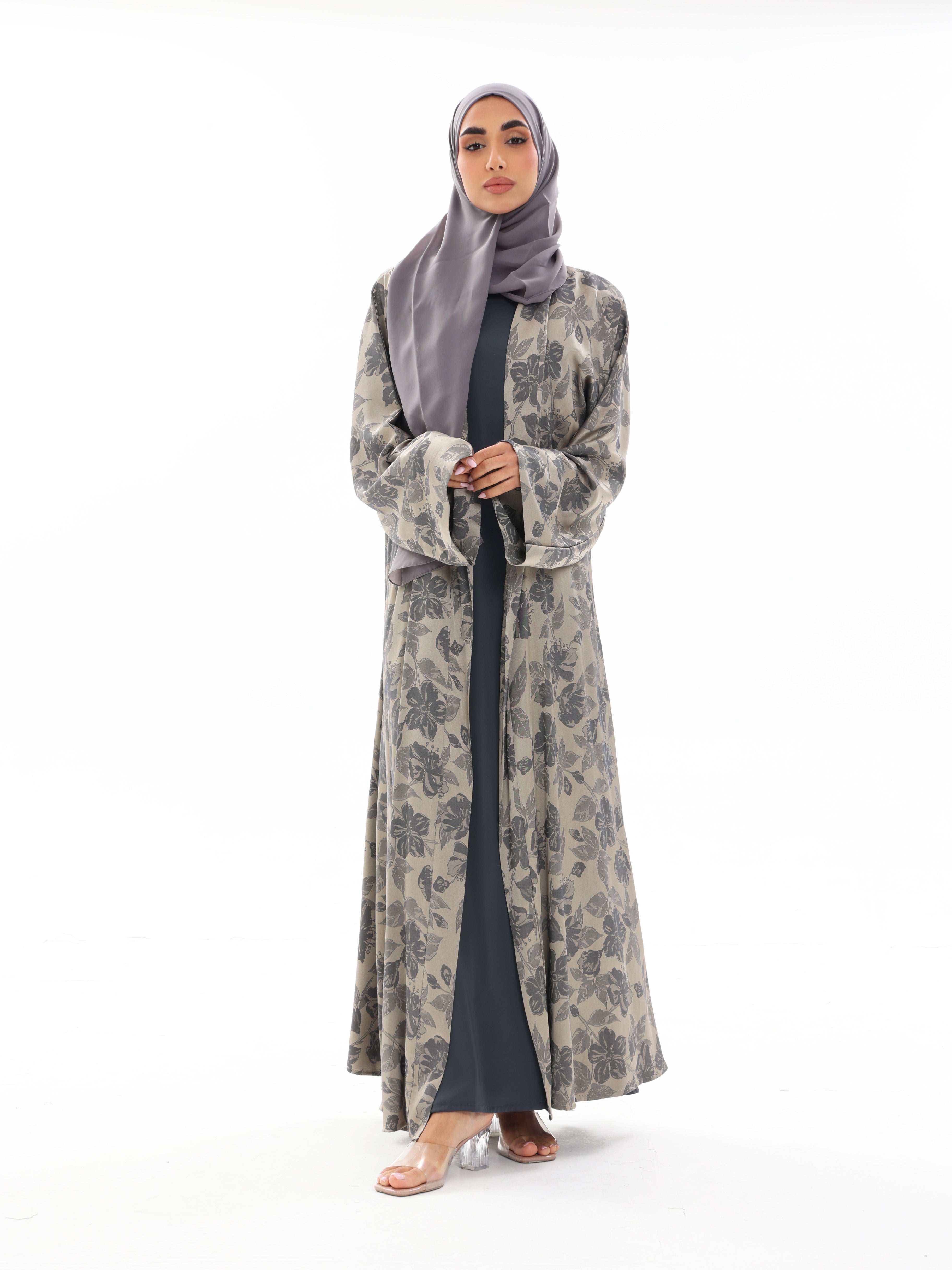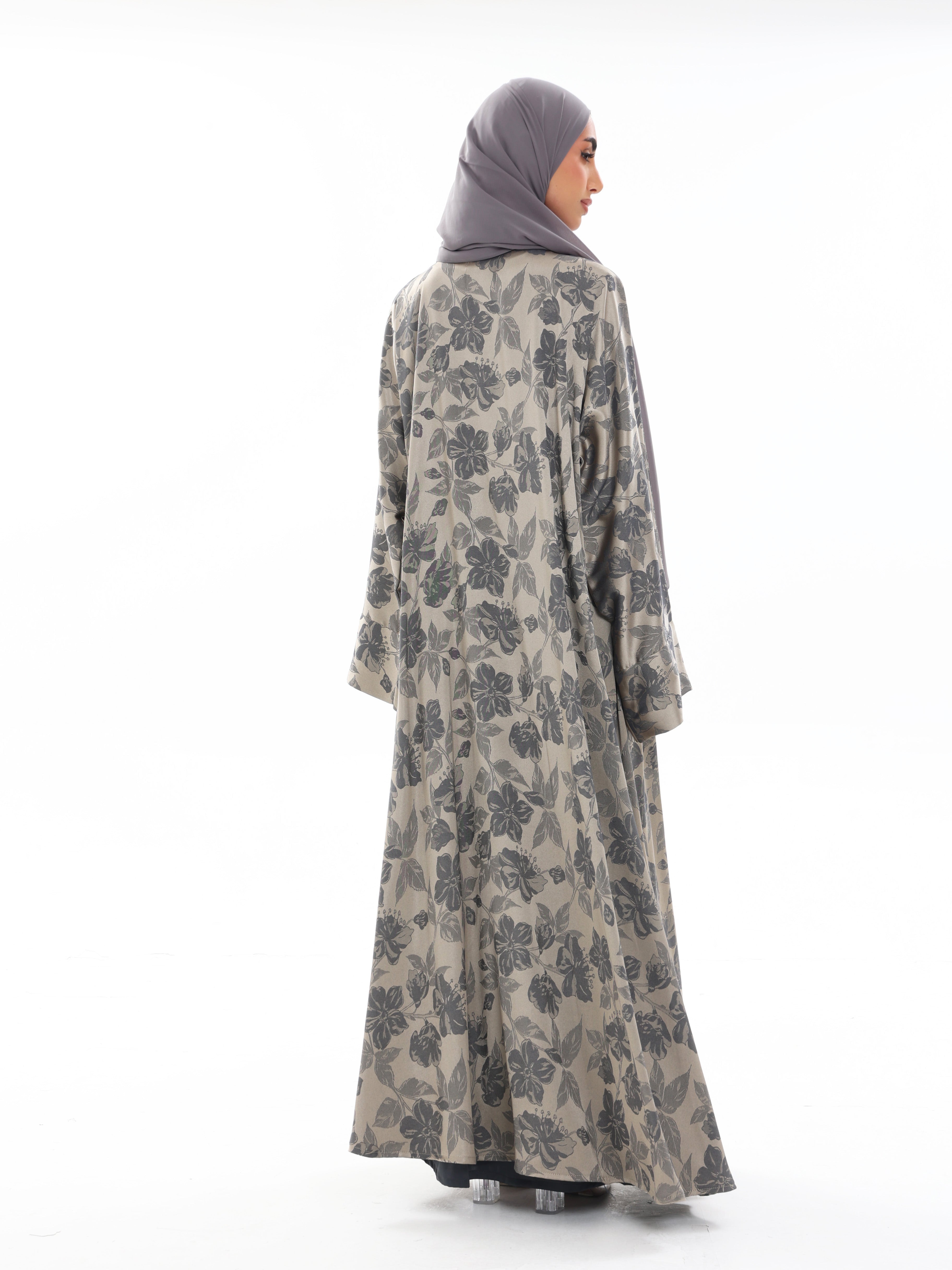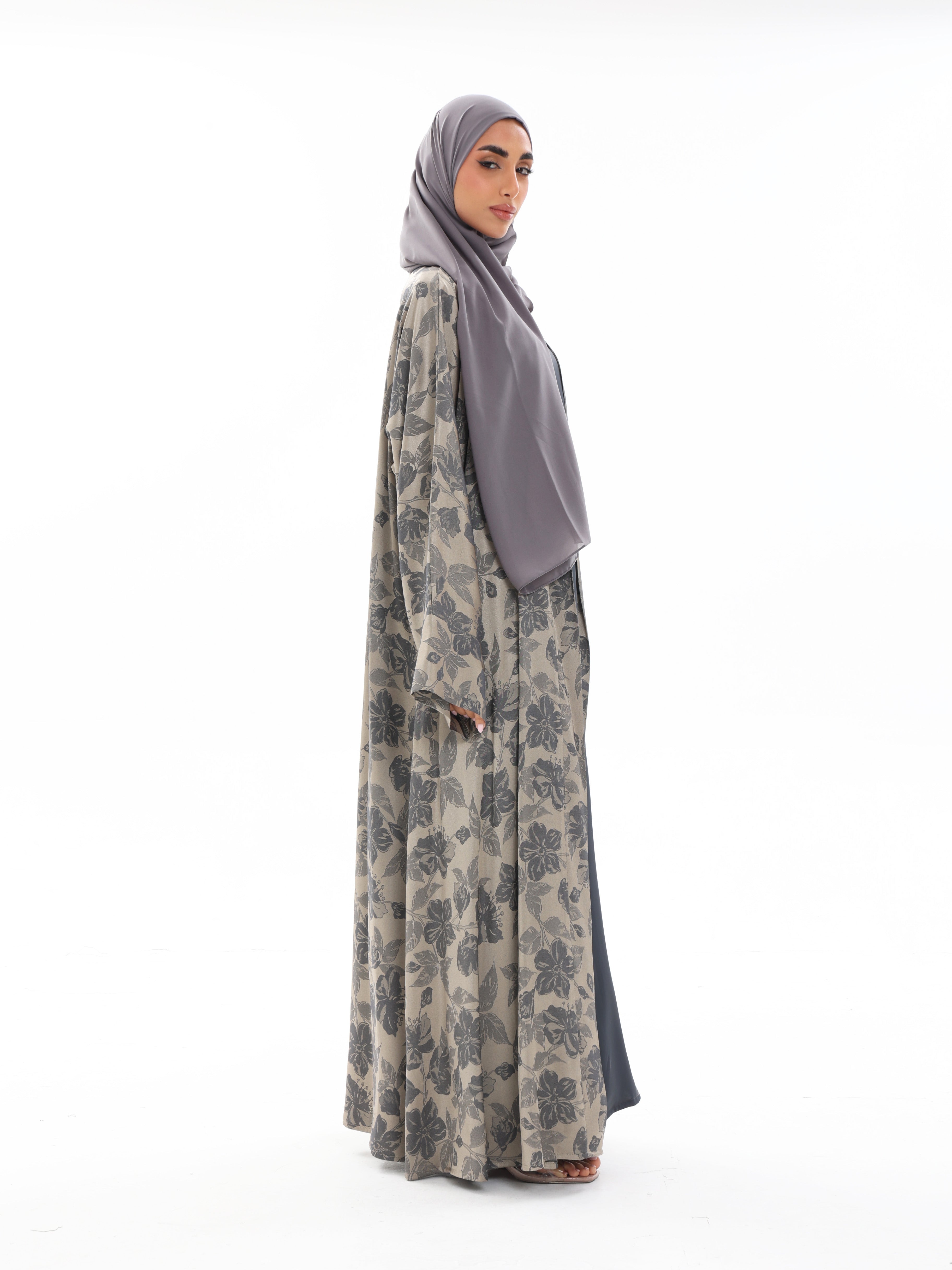 Muted slate tones blend with soft floral texture for understated depth.
