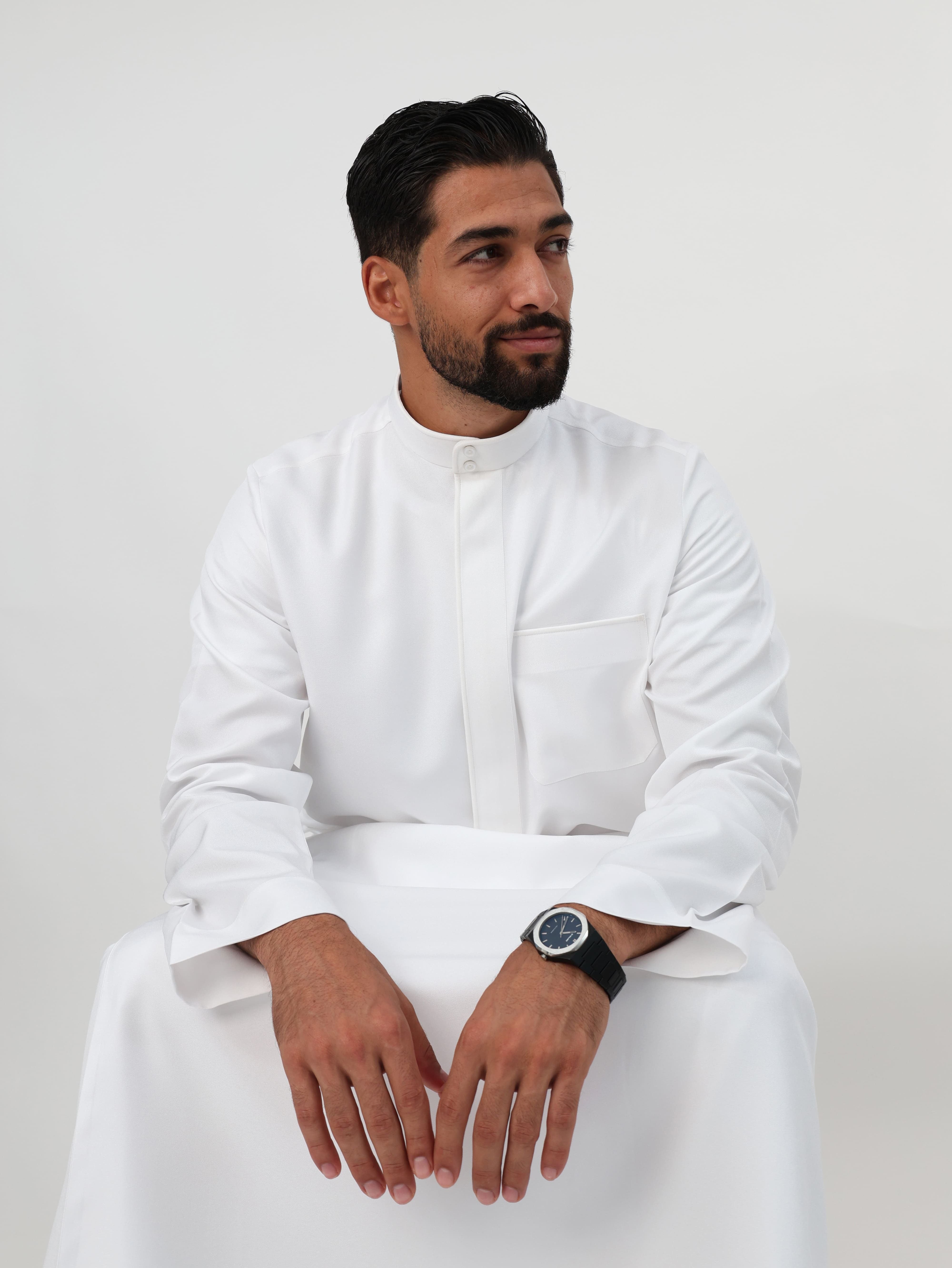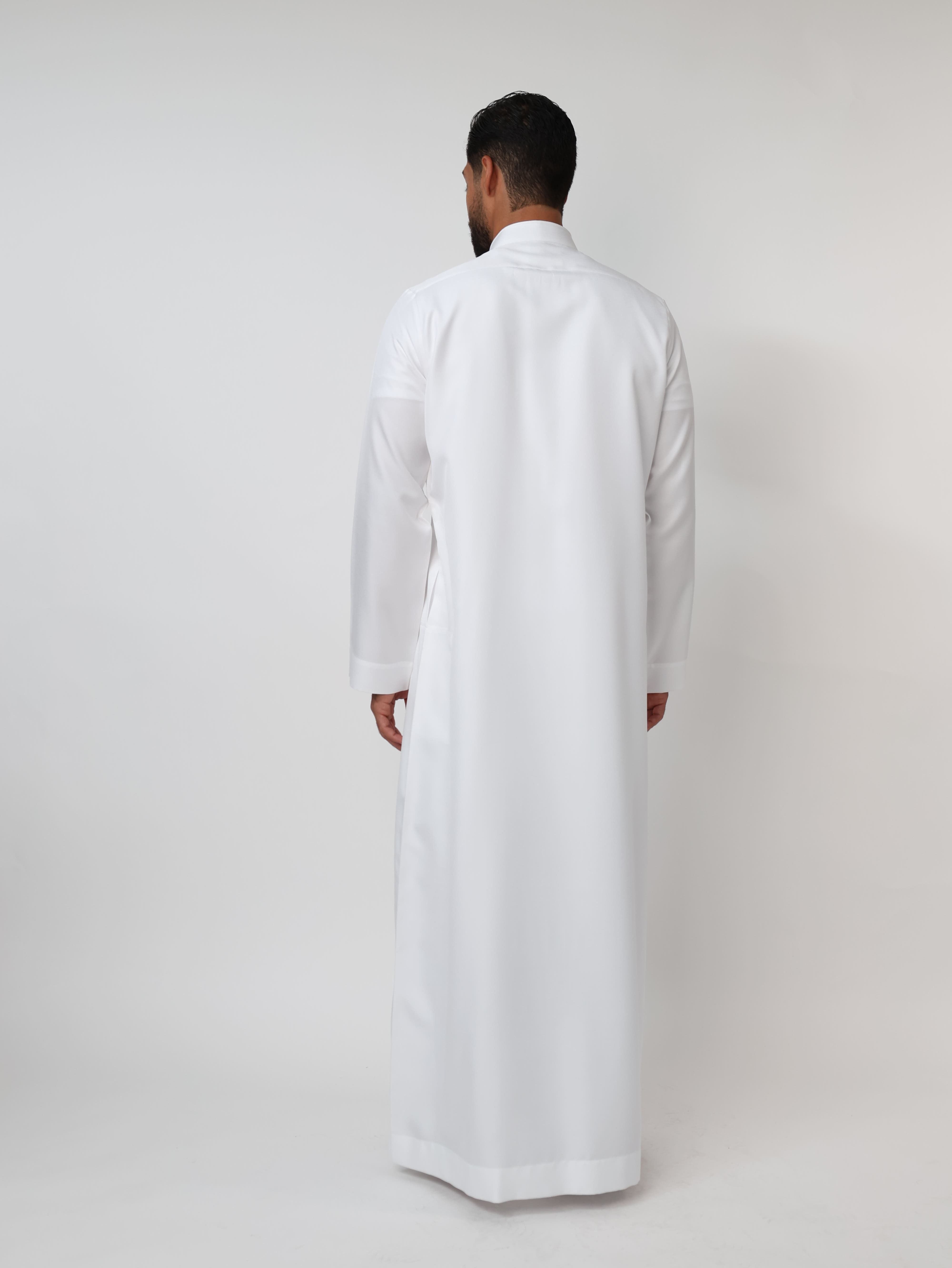 A classic kuwaiti kandura featuring a polished two-button band collar and our innovative sleek zip closure, replacing traditional buttons for a cleaner, more streamlined look. We’ve added a final touch of sophistication with minimal, clean embroidery on the border, offering a subtle design that speaks volumes.